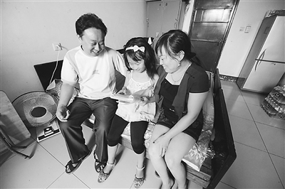 7月14日,河北廊坊洪宽木业公司员工岳良伍和妻子接来了在四川绵阳上小学、刚刚放了暑假的小女儿,在公司提供的“夫妻房”里一家三口尽享天伦之乐。据悉,为了方便外来务工人员的生活,洪宽木业公司投资修建了近200间“夫妻房”作为外来务工人员宿舍,并配套了篮球场、台球室、休闲迪吧和棋牌室等娱乐设施,使来这里工作的外来务工人员生活舒适、工作安心。本报记者 张宪 摄