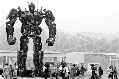 中国最大的变形金刚矗立在鸟巢北侧,这个用几十辆报废汽车等材料做成的艺术品成为“镇园之宝”。