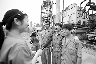 7月16日上午,河北凯跃化工集团某化工车间控制室的几名员工正在接受企业自办电视台记者的采访。凯跃集团为了加强对职工的政治思想教育、使企业文化生动化、多样化,增强企业的凝聚力,投入一万多元办起了企业内部的电视台,用大量的时间段报道一线职工中的模范先进事迹,使职工们成为了真正的“明星”,增强了主人感和荣誉感。