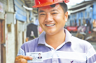 7月23日,一名农民工展示他领到的居住证。当日,中山边防支队沙头涌边防派出所开展送证上门暨居住证派发活动,辖区首批300余名农民工首次领到盼望已久的居住证。据悉,居住证将取代暂住证,农民工可以通过做义工、献血、参加社会保险、社会服务等形式累计积分,积分可以解决入户、子女入学、社会救助等问题。据悉,自广东今年启动居住证以来,已有上万人领到居住证。柴魏 摄