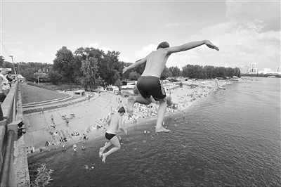 7月21日,在乌克兰基辅市水上公园,游客跳入河中戏水避暑。乌克兰近日持续遭到热浪袭击。新华社发 斯塔拉斯坚科 摄