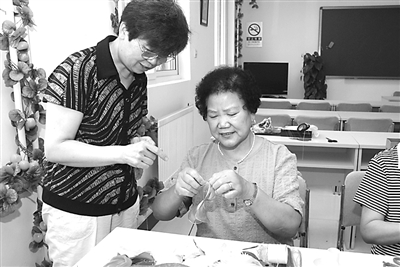 老人在学习制作丝袜花