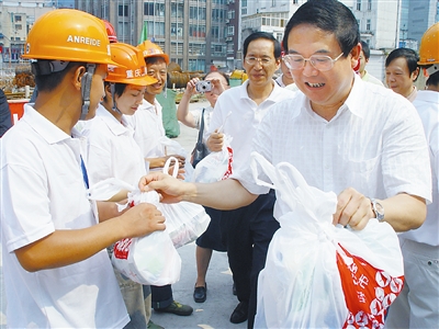 重庆市人大常委会副主任、市总工会主席胡健康(右一)看望慰问劳动竞赛职工