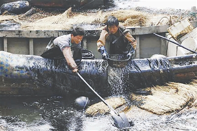 7月25日,工作人员在辽宁省大连市南砣渔港清理海上溢油。