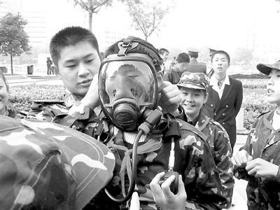 今年以来,江苏省南通市全面开展社会单位消防安全达标建设活动,以全面提升社会单位的火灾防控能力。近期,他们又深入中小学校,指导学生使用消防器材,通过“大手牵小手”活动,进一步筑实消防安全达标建设活动。图为该市唐闸小学学生在消防官兵指导下试带空气呼吸器的情形。