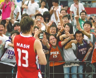 7月24日晚,2010年姚基金慈善义赛在北京奥林匹克国家体育馆进行,对阵双方为美国男子职业篮球联赛球星与中国男篮。此场比赛共筹集善款900多万元,将为贫困落后地区的孩子们送去温暖和帮助。赛后,当红明星纳什走到观众席前与球迷互动。