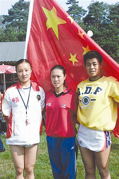 2002年在荷兰阿兰市举行的第50届军事五项世界锦标赛上,女子个人冠军王莹(中)、亚军田琳娜(左)和季军徐蕾在赛后合影(资料照片)。|