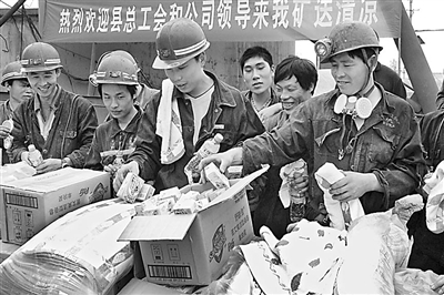 7月25日,在江苏宏安集团赣榆瓦庄煤矿,一线矿工领到防暑降温用品后十分开心。连日来,江苏省赣榆县总工会开展“送清凉行动”,看望慰问坚守在炎热高温天气下作业的一线职工,并为他们送去了矿泉水、凉茶、风油精等防暑降温物品。司伟 摄