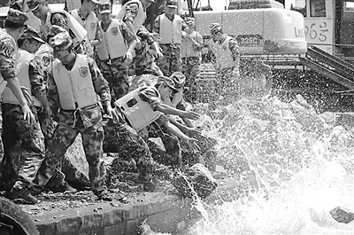 7月26日,在江西九江彭泽县棉船镇,前来抗洪的南京军区73021部队官兵将最后一批石料投入长江,稳固堤岸。当日,江西九江彭泽县棉船镇堤岸抛石固岸工作全面完成。7月18日,江西九江彭泽县棉船镇堤岸受连日高水位浸泡冲击,出现崩岸险情。险情发生后,前来抗洪的南京军区73021部队官兵连同当地群众一起向长江内抛石固岸,最终将险情排除。新华社记者 周密 摄