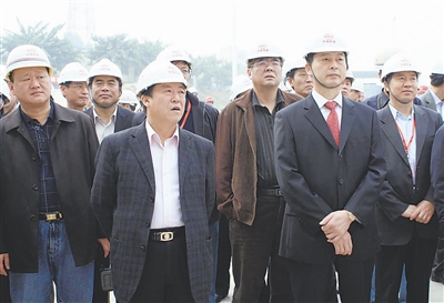 中国铁建总裁赵广发(前左二)在中铁十八局集团公司党委书记郝趁义(前右二)陪同下现场办公