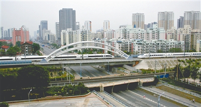 两列京津城际高速列车同时通过中铁十八局集团承建京津城际跨新开路钢管拱桥