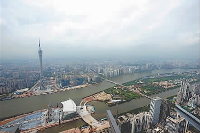 坐落在珠江里的海心沙岛(画面左下角)犹如一艘扬帆起航的巨大帆船(摄于7月22日)。广州亚运会开闭幕式举办场地——珠江海心沙岛面积约17万平方米。岛上功能结构分三部分:西面为看台,共25000个座位;中部为表演区,由舞台、风帆和喷泉组成;东面为保障区。岛上设有2处码头、5座桥和1条隧道。出于开幕式方案的保密需要,目前海心沙在封闭施工,计划8月完工。亚运结束后,海心沙将打造成亚运主题公园。新华社记者 刘大伟 摄