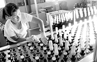 7月25日,江西索普信(万年)实业公司女工汪丽萍仔细检查即将出口巴西的节能灯的质量。据了解,该公司是年产5000万盏节能灯和电器自动控制备件的光伏企业,同时安置当地500多农民工在家门口就业。