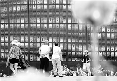 7月28日,唐山各界干部群众在唐山地震遗址纪念公园集会,纪念唐山抗震34周年。人们在唐山地震纪念墙前祭奠罹难亲人。 郭新 摄