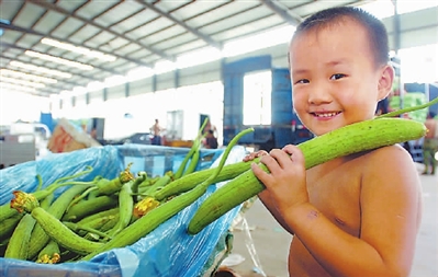 7月27日,在济南市匡山农产品综合交易市场,来自济南市济阳县的刘旭手拿丝瓜做玩具自得其乐。每逢暑假到来,这里总会传出孩子们爽朗的笑声,他们像“候鸟”一样回到在市场内打工的父母身边度过快乐的暑假。 新华社记者 郭绪雷 摄