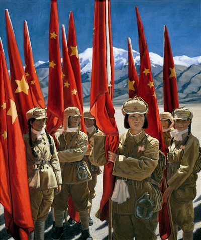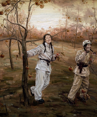 军旅激情仍在激荡着艺术家的创作。《红色娘子军之歌》、《训练日》、《难忘十月柿正红》、《进藏女旗手》等许多美术作品,作者来自军内和地方,为同样的感动而创作,创作者以今天的眼光,诠释走过或正在走过的平凡与不平凡。读懂作品就读懂了艺术家的情怀,走过的往昔与今天的激动是一脉相承的奉献和理解。看到这些感人至深的美术作品,就能感悟:八月一日,不仅仅是军人的节日……(法明)