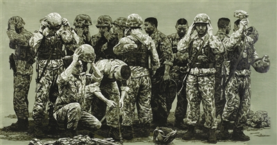 在历届全国美术作品展览中,军事题材亦或泛军事题材的作品都占有很大的比重,创作者不仅来自军旅,许多地方作者对此题材亦是情有独钟。因为,这一题材牵连着许许多多的激动和感人,创作的激情正是由此而发。回眸走过,经历当下,展望未来,军旗正红,军歌嘹亮。