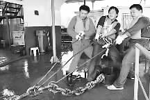 7月28日8时45分,江汉油田水电厂供水车间一级泵站班长梁文权(中)巡查汉江红旗码头时发现,因水位变化,原本绷直的锚链已松,眼看船体要受损、后方13万油田居民的唯一取水口有险。情急中,他带班员黄波和张万明按下锚机,拼全力拉着锚链,直待500多公斤的锚链被缓缓收回。从19日至今,洪峰两次凶猛过境,油田却因他们的日夜巡保而安然无恙。李沭 摄