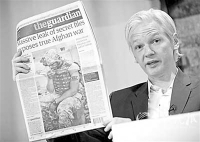 7月26日,“维基揭秘”网站创立者朱利安·阿桑奇召开新闻发布会,他手拿一份《卫报》,报上头条就是此次“泄密事件”。西蒙 供图