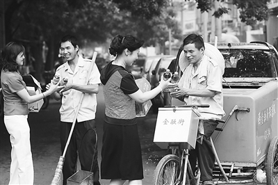 7月29日,北京持续35摄氏度以上的高温湿热天气。当天,北京市西城区总工会和金融街道办工作人员来到金融街保洁队,为一线工人送上62箱饮料、4大袋绿豆等消暑品和2000元慰问金。为了职工平安度夏,北京市总工会在全市大力开展“送清凉”活动,特别是对建筑工地、高温作业场所进行检查,通过调剂工作时间、发放消暑品等措施保障职工的合法权益。本报记者 杨登峰 摄
