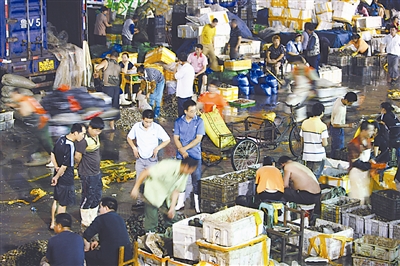 8月1日凌晨,大连水产品批发市场一片繁忙景象。据该市场值班经理介绍,“7·16”事故发生后,他们加强了对海产品检测,目前尚没有发现异常,水产品交易基本没有受到影响。卢国忠 摄