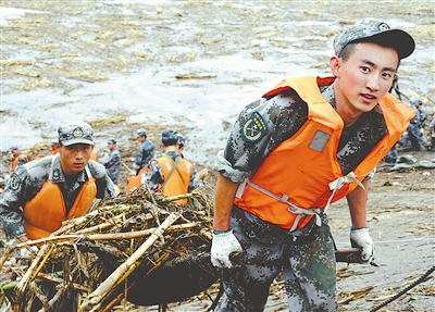 8月3日,战士将打捞上的漂浮物运往大坝外侧。