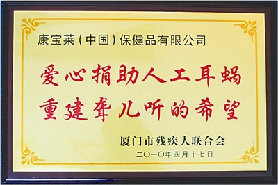 2009年7月,由康宝莱发起成立的“天使听见爱”慈善项目在厦门诞生,由康宝莱出资帮助听力残障孩子植入人工耳蜗,并进行康复训练。今年刚刚5岁的厦门小女孩林芳纯成为“天使听见爱”项目资助进行耳蜗植入手术的孩子。手术结束后,小芳纯会彻底告别无声世界。康复后的小芳纯将作为上海世博的最后一名小志愿者,把自己的手印和对康宝莱人的爱一起留在上海。近期,公司从媒体得知山东济南的6岁贫困女孩刘麦患有听力障碍,便决定捐赠22万元人民币,资助其进行手术恢复听力。