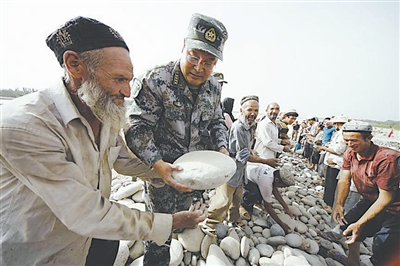 8月5日,和田军分区的官兵和当地群众在新疆和田县拉依喀乡喀拉喀什河畔加固防洪大堤。自7月29日以来,新疆和田地区发生百年不遇的洪水,许多道路、村庄被毁,上千群众的生命财产遭受威胁。和田军分区第一时间启动抗洪抢险应急预案,出动官兵奋战在抗洪一线,和群众一起搬石筑堤,确保人民群众的生命财产安全。 新华社记者 李翔 摄