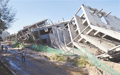 8月5日,经过爆破拆除后的违法建筑连片倒塌。
