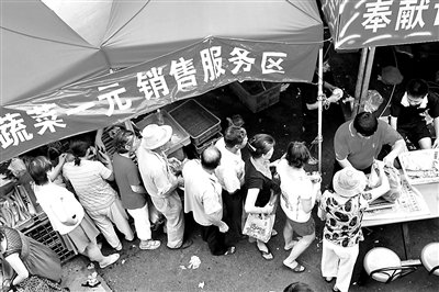 今年6月18日,上海徐汇区徐虹北路上的新徐虹菜场开设了“一元菜市”。到现在一个多月过去了,“一元菜市”不仅天天营业,而且菜的品种也越来越丰富,每天销售的蔬菜量从不到1吨增加到近3吨。由于是企业自己补贴菜价的差额,越来越大的销量让他们也感到了压力。经营者表示,他们已经在想办法降低成本,坚持把这个项目办下去。 齐云峰 摄