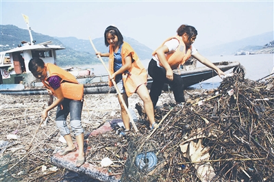 8月5日,重庆市云阳张飞庙对岸、新县城正前方水域,三名“女子清漂队”的队员们冒酷暑、战高温打捞江上漂浮物。自三峡库区清漂工作开展以来,云阳县为弥补水上环卫工人的不足,陆续组建了一支20人~30余人的“女子清漂队”,年龄在19岁~45岁之间,作为库区清漂的后备力量和应急分队,10多天来已打捞上岸各类漂浮物800余吨,约占目前清漂总量的40%。饶国君 摄