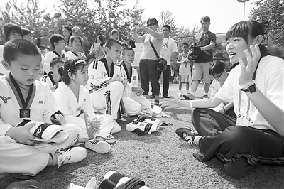 8月8日是第二个全国“全民健身日”,上万名北京市民聚集朝阳公园进行各式各样的健身活动。图为世界冠军罗薇指导小朋友们跆拳道的要领。