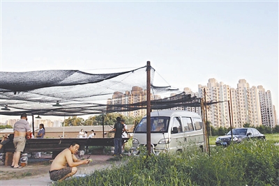 8月5日,北京泛海闲置地块的住户在荒地上支起台球桌打台球。