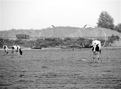 今年5月以来,一些采沙者在哈尔滨城北30多公里、呼兰区富强村呼兰河畔的滩涂湿地非法挖沙取土,肆意蚕食河岸、毁坏湿地,十余万平方米的草原牧场被啃噬,生态环境遭到破坏。新华社记者 周确 摄