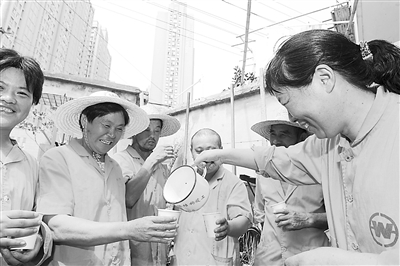 8月5日,合肥市瑶海区市容局的工作人员为辖区的环卫工人精心准备了“环卫防暑包”和清凉可口的绿豆汤,在高温酷暑中为他们送上了一份“安全”、一份“清凉”。当日上午,合肥市瑶海区市容局开展多项行动向一线环卫工人“送安全”、“送清凉”。