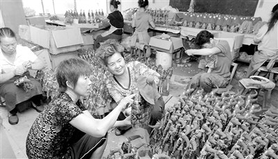 辽宁省义县返乡农民工夏淑雅(中)自主创业,她成立工艺品生产专业合作社,利用树枝、草根、秸秆等材料制作各种工艺品,并远销欧美10几个国家。在她的带动下,300余名女性农民工离土不离乡实现务工,走上致富路。李铁成 摄
