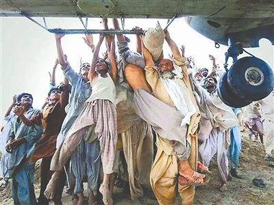 由于连降暴雨,巴基斯坦西北部地区遭受了80年来最严重的洪灾,并已造成至少1600人死亡,所以灾民们都急于逃离灾区。图为8日一架运送救灾物资的直升机飞离时,灾民们争相吊在直升机上想搭机离开。肖劼 供图