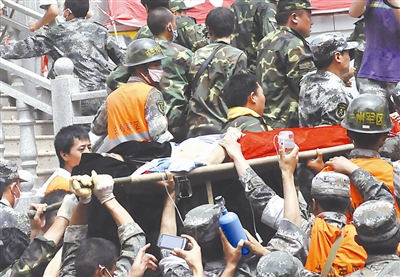 8月10日10时许,甘肃舟曲县泥石流救援现场的移动大楼附近发现一名幸存者,经过四川广元军分区救援人员1小时30分的紧张营救,一位老人被成功救出。刘忠俊 摄
