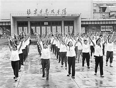 从1951年起第一套广播体操公布至今,大约每隔几年,我国都会根据社会的发展和国民体质的变化更新一次。这是1971年,北京市东风市场工作人员在上班前做第五套广播体操。 新华社发