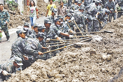 8月10日,救援部队清理舟曲中心城区的街道。据当地政府统计,截至11日17时20分,舟曲特大山洪泥石流灾害已造成1117人死亡,已解救1243人,有627人失踪。新华社发(亮亮摄)