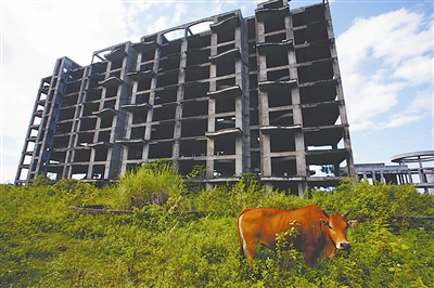 8月11日,海南海口椰海大道一处小区住宅楼,除了底层几户有工人临时居住外,几栋高的数百间楼房空无一人。部分楼房的阳台已爬满野草,小区俨然成了牛的“乐园”,不时在小区内漫步啃草。据一名临时居住在房子里的工人介绍,该小区的楼房至今已闲置了近十年之久。