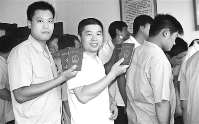 8月11日,在山东丰源煤电公司北徐楼煤矿办理“转正”现场,拿到“两册”(养老保险金和医疗保险金手册)后的农民工在排队等候输入身份证信息。