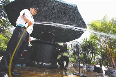 8月12日13时,重庆市大足县交巡警平台上,协勤正在洒水降温。平台内气温高达45℃,但警员们仍在坚守岗位。当天,该市气象台发布“高温红色预警”信号,该市30个区县日最高气温升至40℃以上。罗国家摄