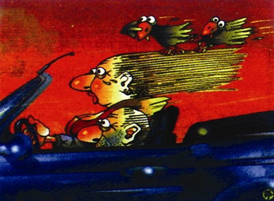 开着跑车飞驰的老妇人心旷神怡长发飘飘,两只鸟儿就势搭载其间。马达声声,鸟鸣阵阵,真可谓是顺风而行相得益彰。