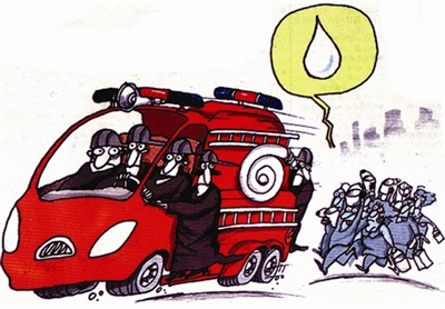 消防车已启动,居民提着水桶,追上前来奉献自己一份绵薄之“力”。看似笨拙的举动体现着心灵之美、爱心无限。