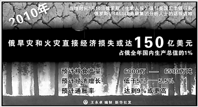 肆虐的旱情给各地区带来巨大经济损失。俄罗斯的分析家称,高温天气所导致的干旱与山林大火等自然灾害,造成的短期经济损失可能将达到2010年俄罗斯国内生产总值的1%,约150亿美元。