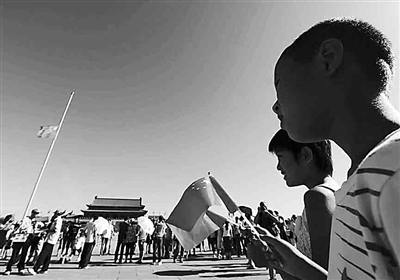 8月15日上午,两位小朋友在父母的带领下来到北京天安门广场半降的国旗前肃立默哀,哀悼甘肃舟曲特大山洪泥石流遇难同胞。本报记者 张宪摄