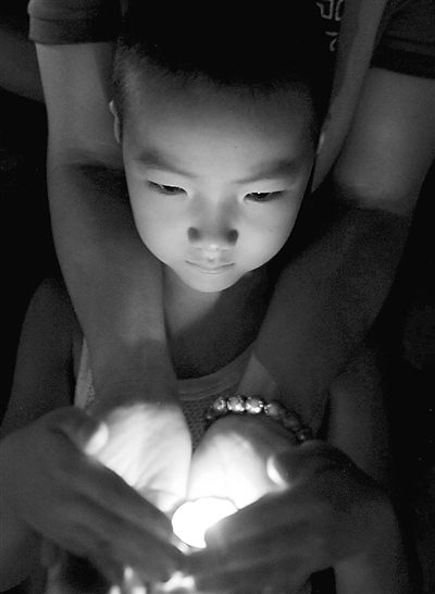 8月15日,在石家庄市文化广场,一名男孩和他的母亲一起点亮烛光为遇难同胞祈福。当日,全国各地举行哀悼活动,悼念甘肃舟曲特大山洪泥石流遇难同胞。