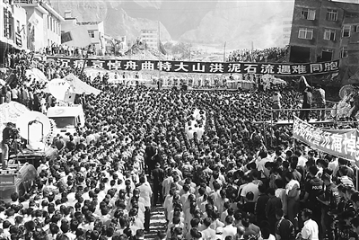今天,举国上下沉浸在无比悲痛之中。北京天安门、新华门和全国人大常委会、国务院、全国政协、中央军事委员会、最高人民法院、最高人民检察院所在地,全国和驻外使领馆,都下半旗志哀,全国停止公共娱乐活动,以表达对甘肃舟曲特大山洪泥石流遇难同胞的深切哀悼。