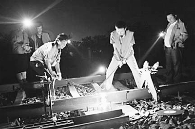 8月12日晚,南昌铁路局鹰潭工务机械段的工人们在九江长江大桥铁路桥南引桥下行线焊接打磨钢轨。当日,九江长江大桥铁路桥上、下行线更换钢轨工作顺利完成。